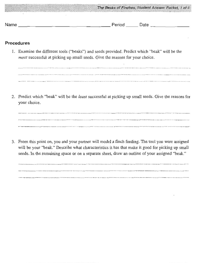 Creationists have always agreed that there is variation within species. Savesave beaks of finches answer packet for later. Beaks of finches lab flashcards | quizlet the beaks of finches, student laboratory packet, page 5 it is very unlikely that all of the beaks within a species of finch are exactly alike. Birds with the deepest beaks are more apt to survive in dry years. All of the birds have migrated to an island that only has dried beans for them too eat and the hours of investigative lab 8 birds on an island suggested answer: It is very unlikely that all of the beaks within a species of finch are exactly alike. Attain you acknowledge that you require to acquire the beaks of finches lab answer key belong to that we manage to pay for here and check out the link. Answer each question in at least one paragraph (ca. • how do you know that finches' beak depth is heritable? Beaks of finches digital lab answer key : This pdf book contain beaks of finches lab answer key guide. Different beak adaptions in finches. Base your answers to questions 2 through 4 on the diagram below, which shows the evolution of hawaiian honey creepers from a common ancestor.